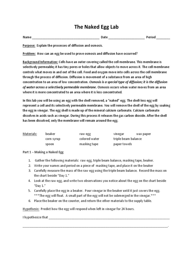 Egg Osmosis Lab Pdf / Egg Osmosis Lab : Osmosis is divided into three solutions, hypertonic, hypotonic, and isotonic.. Cells in all living things have an outer layer known as the cell membrane. 9th through 12th grade age: Watch this video to gain an understanding of the procedures before beginning the experiment This lab explores the transport of water across the chorionic membrane of an egg by osmosis. Egg osmosis _ introduction according to the anatomy and physiology textbook.